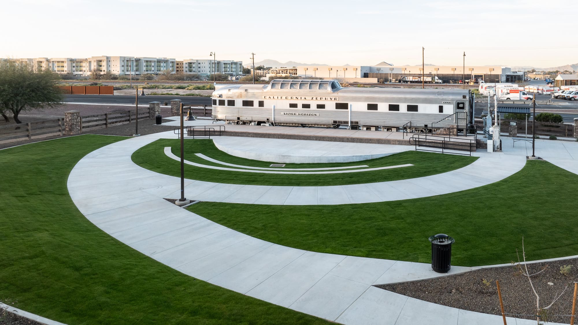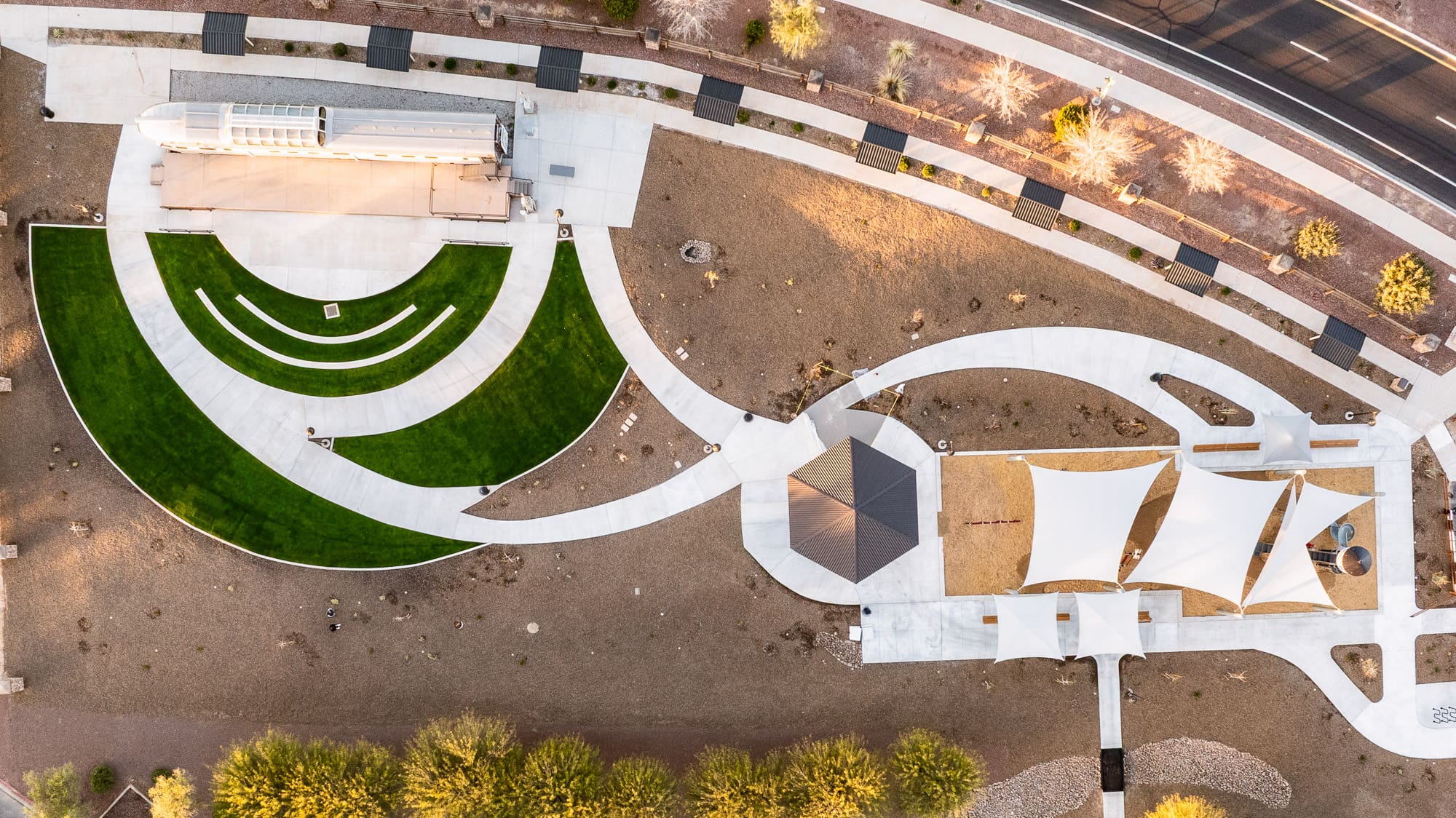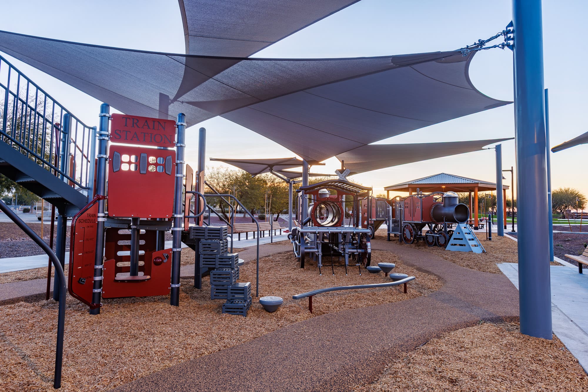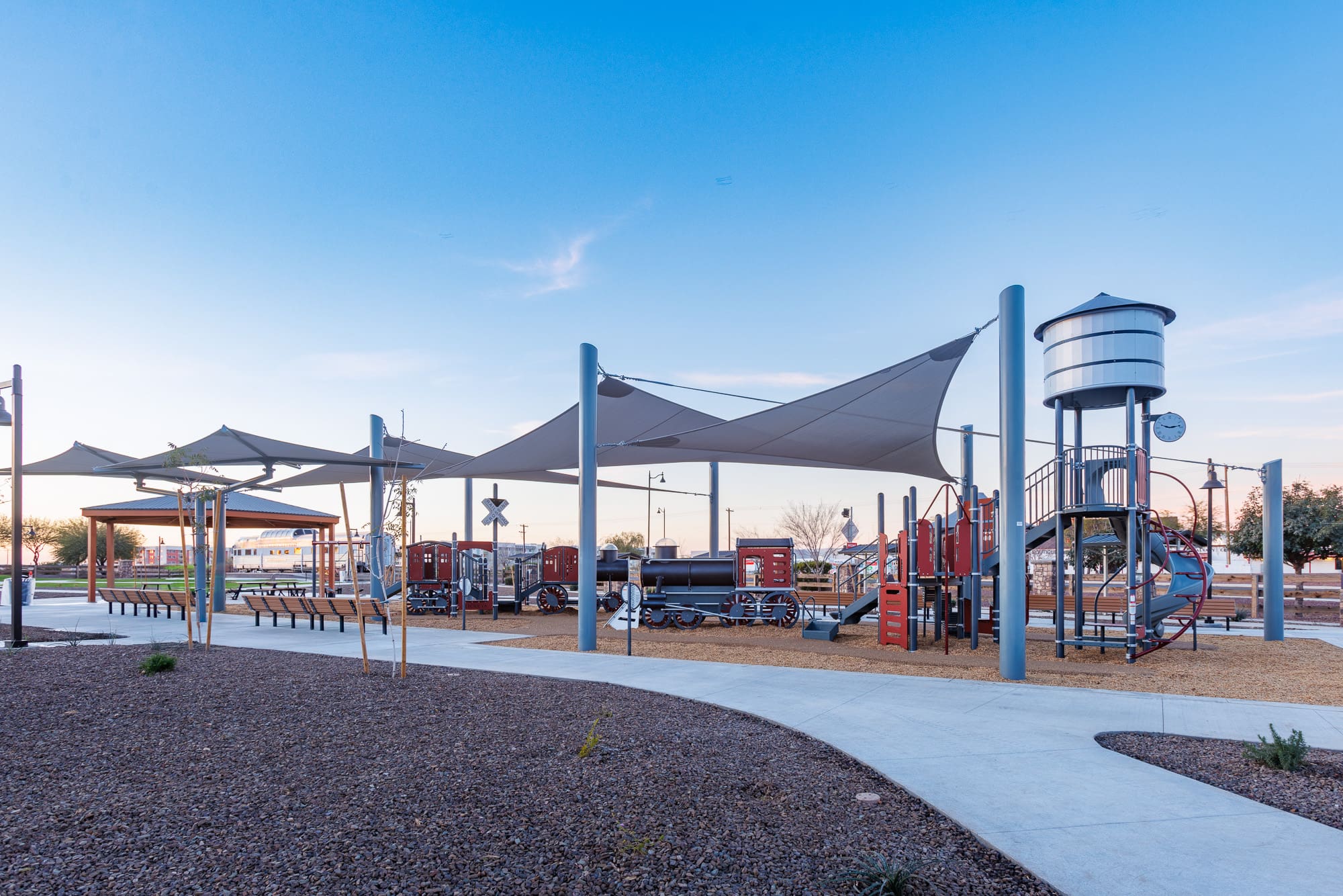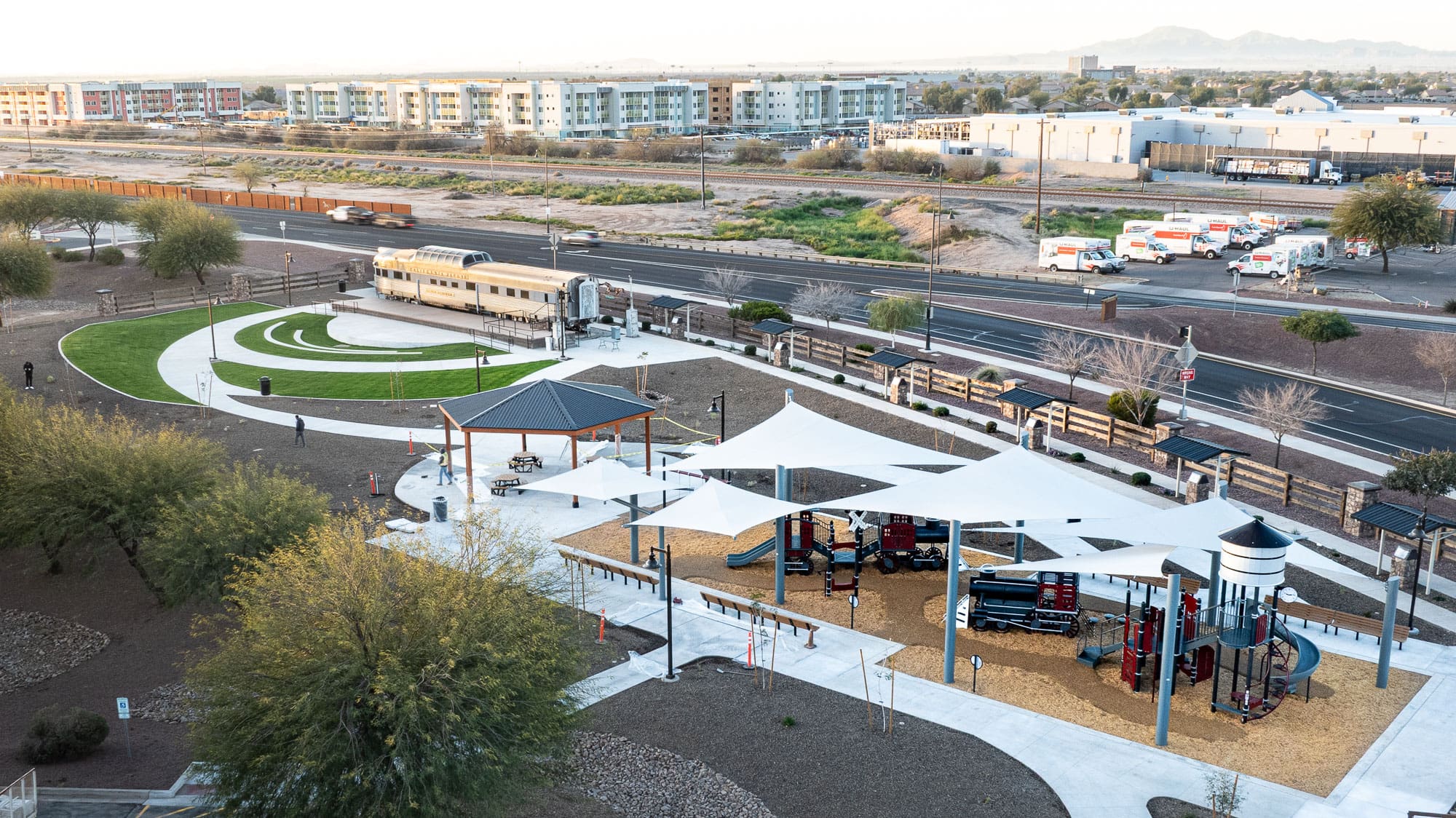 The Maricopa Heritage Park project transformed Heritage Park along Plainview Street in the City of Maricopa’s Heritage District into a revitalized and accessible community gathering space. The scope of work included site grading and earthwork operations, installation of underground storm, irrigation, and electrical utilities, and construction of a pedestrian bridge with steel framing and ADA-compliant grating. Improvements also consisted of concrete flatwork, curbs, sidewalks, hardscape features, and an amphitheater stage, along with new ramada structures, shade sails, playground equipment with safety surfacing, and comprehensive landscape installation, including irrigation and sod. Additional enhancements included site furnishings, lighting, pavement improvements, and the creation of a “Historical Walk” with interpretive placards celebrating the area’s heritage.